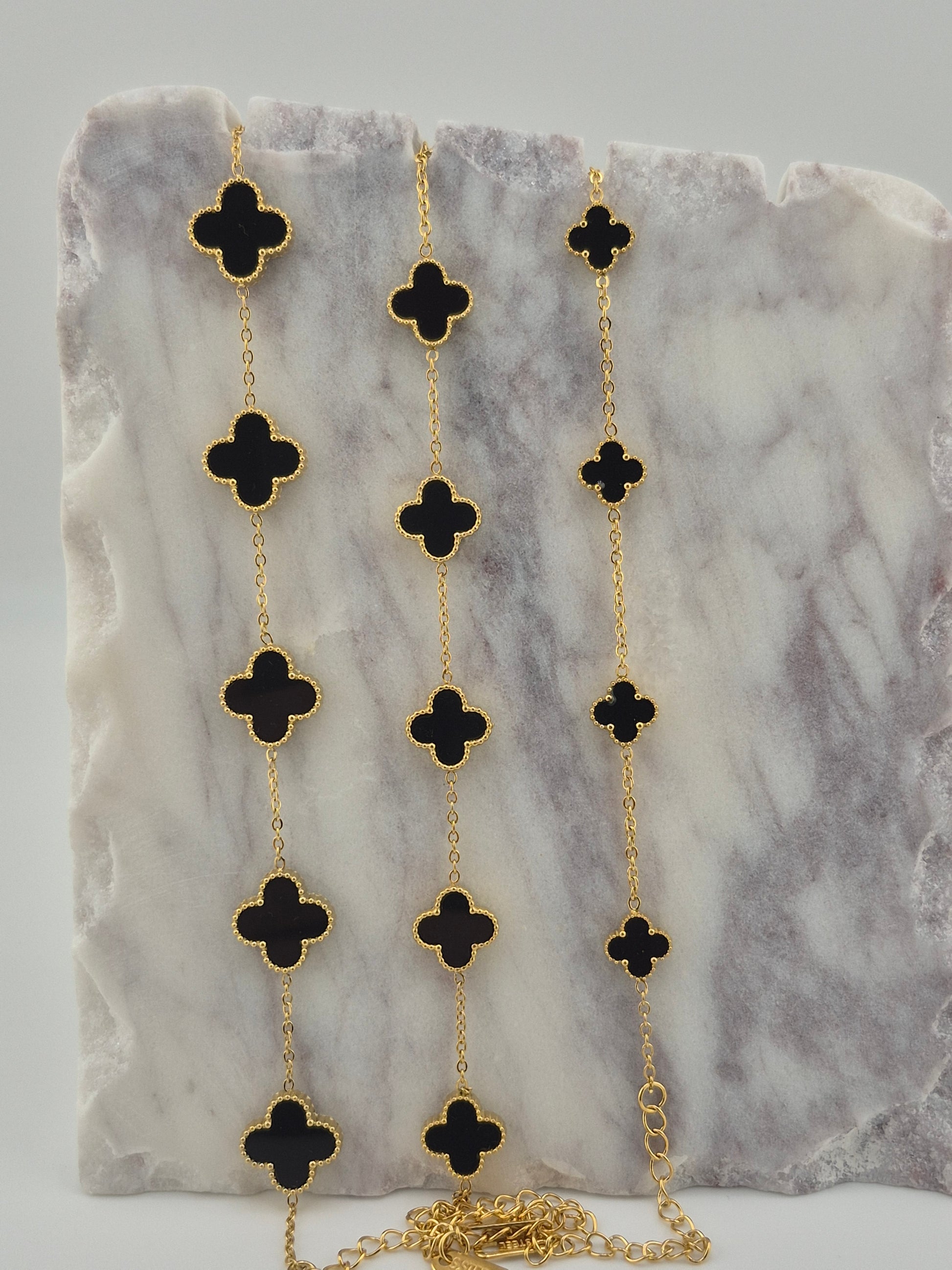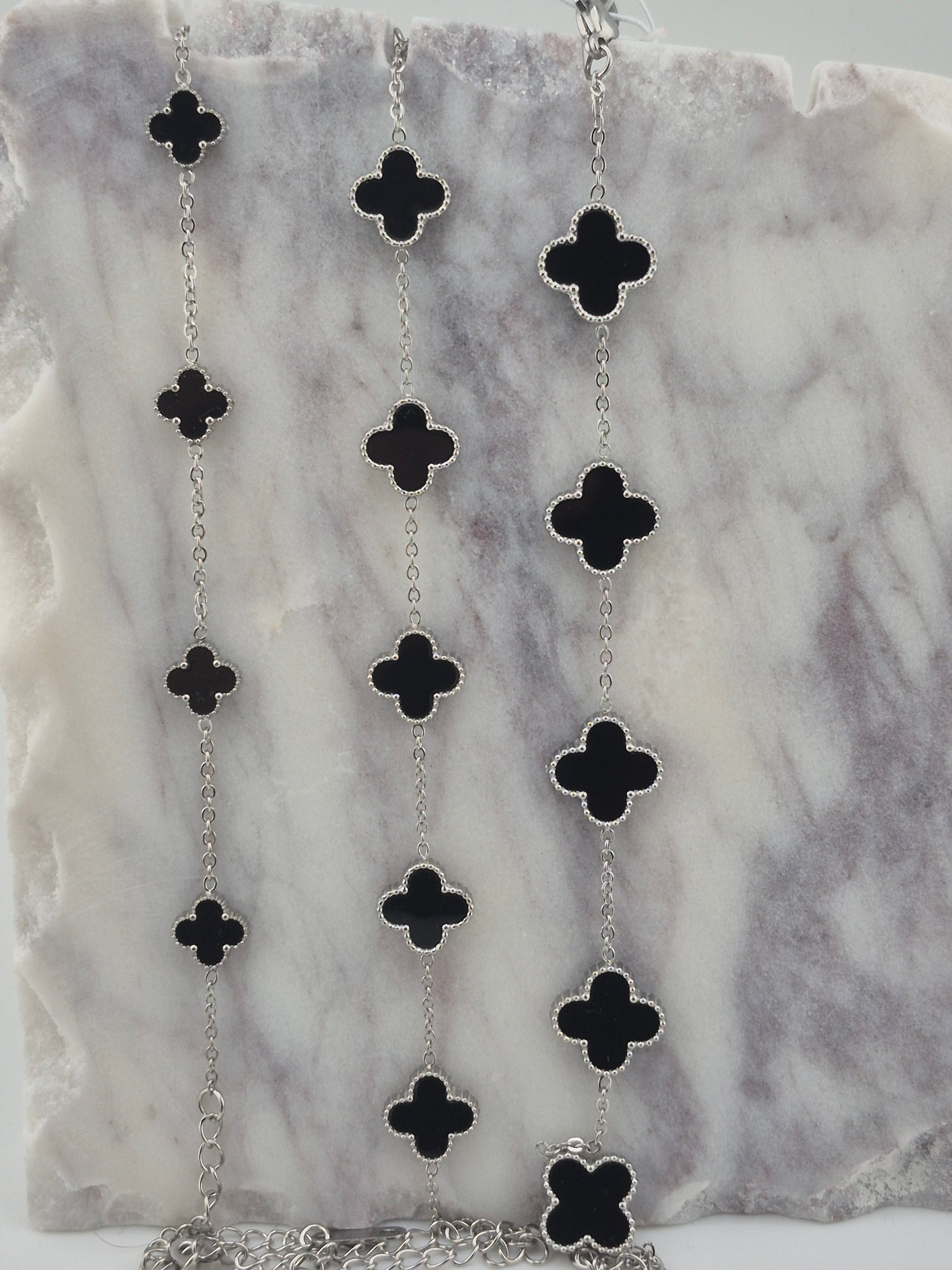 Bracelet, Clover, Onyx, Stirling Silver (Gold and Silver), 3 Sizes