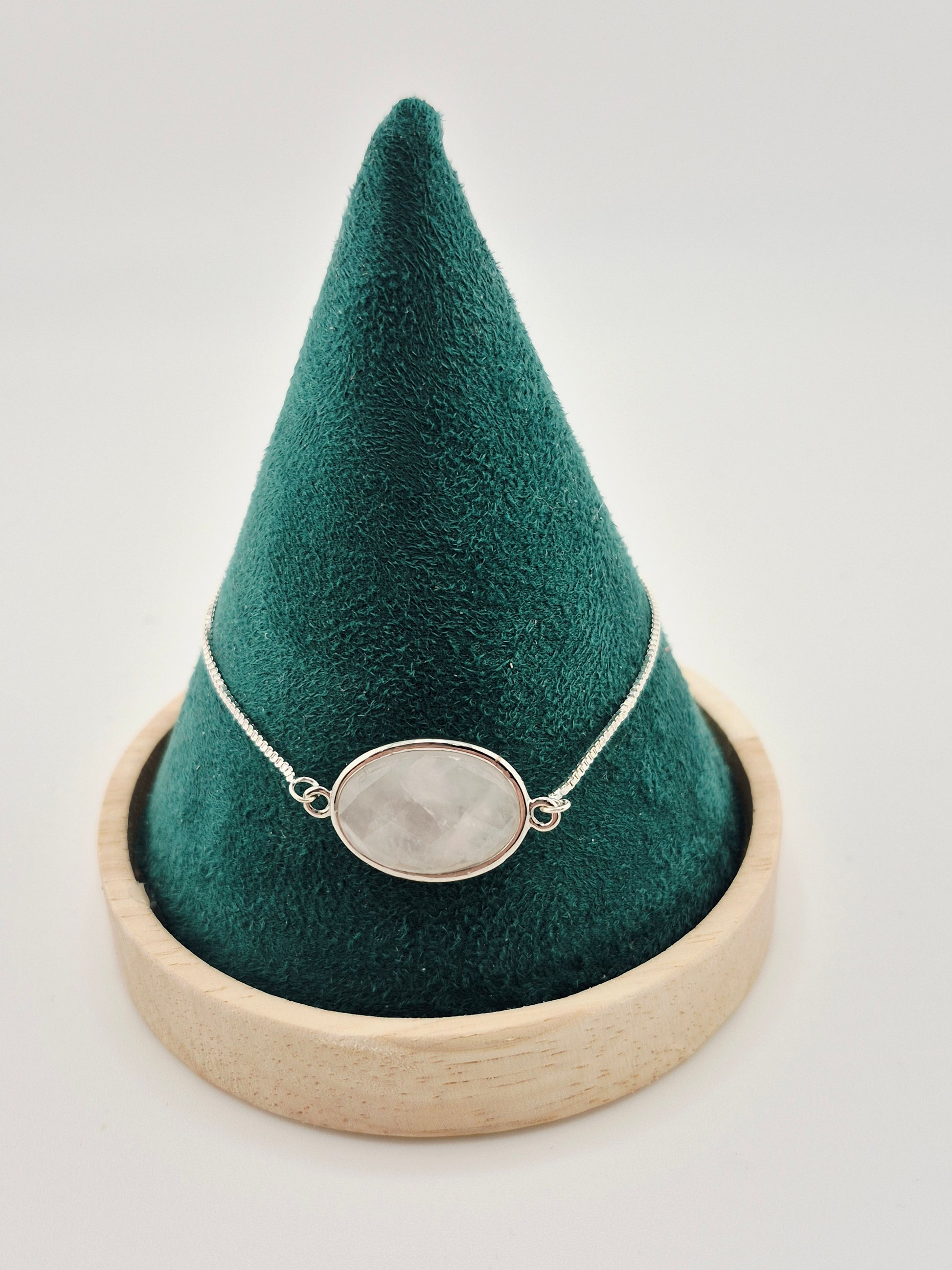 This sophisticated bracelet features a beautifully faceted rose quartz stone set in a sleek platinum setting, complemented by a durable brass slider. Its elegant design adds a refined touch to any outfit, making it a timeless accessory for both everyday wear and special occasions.