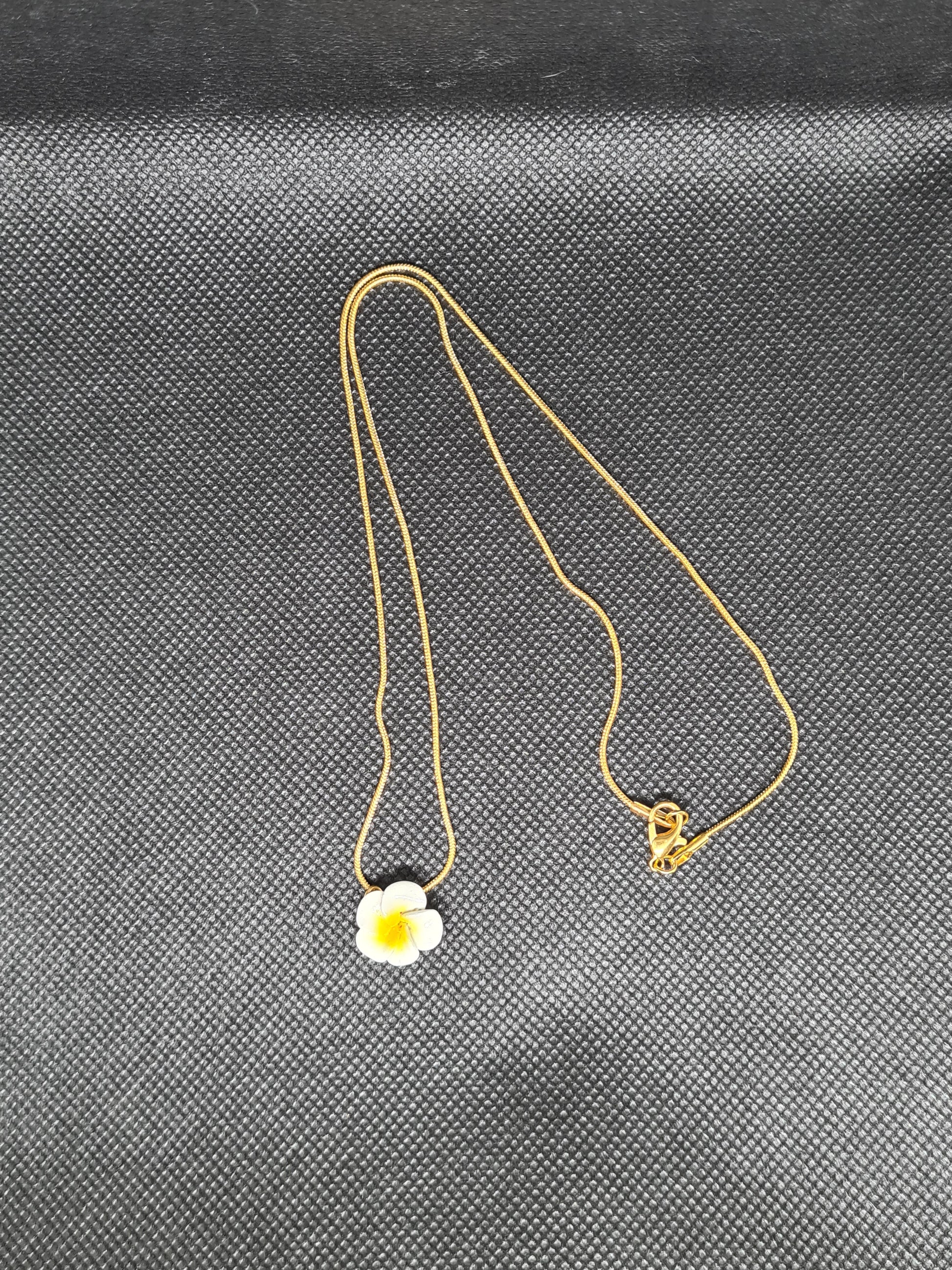 This funky necklace features a playful frangipani pendant in yellow and white, hung on a stylish gold chain. Adding a touch of cuteness to any outfit, this necklace is sure to catch some attention. (Get ready to receive compliments!)
