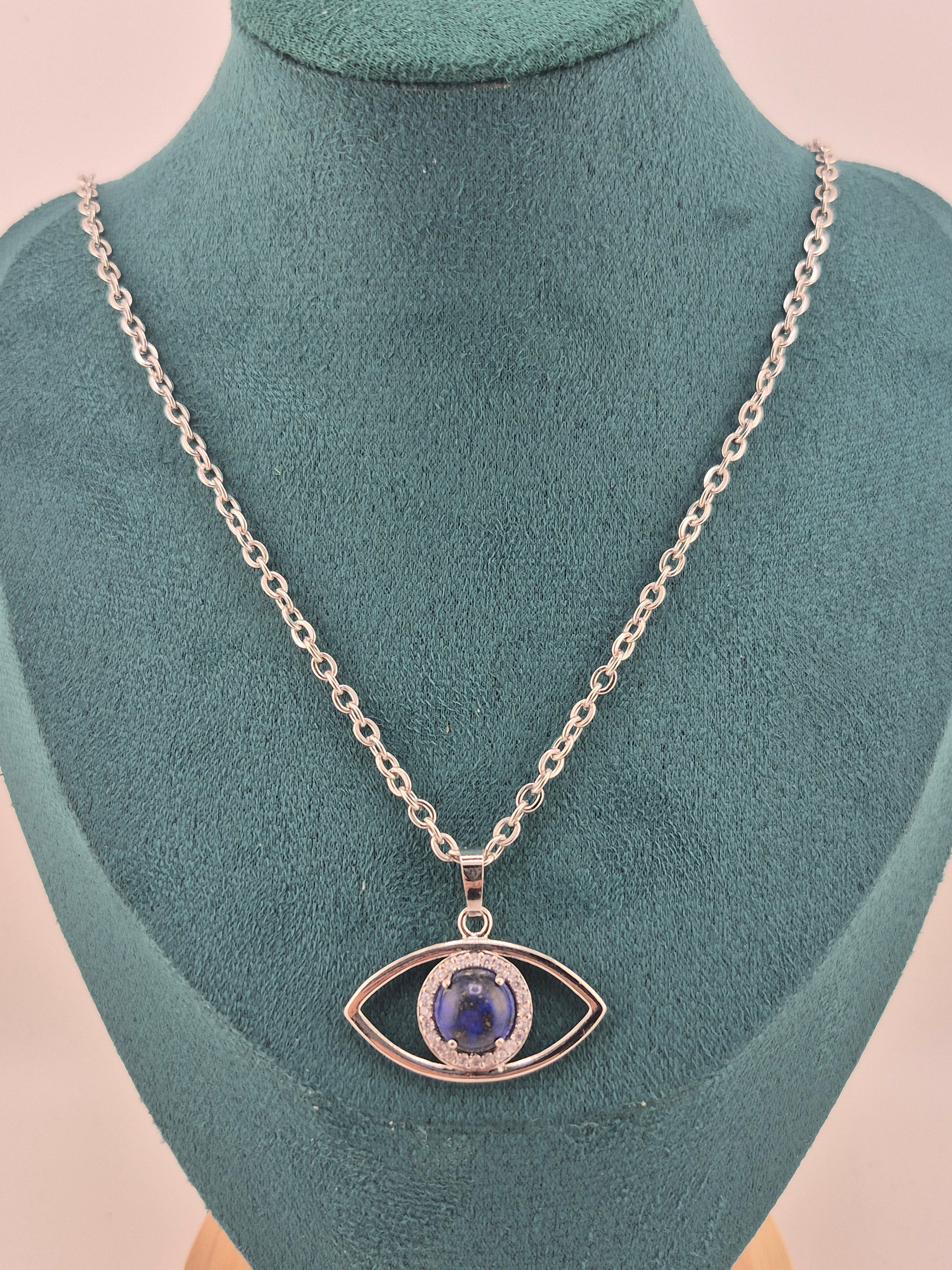 This elegant Evil Eye pendant, crafted from durable silver stainless steel, features your choice of striking Lapis Lazuli or warm Tigers Eye stone. Designed to blend timeless symbolism with refined style, it offers a meaningful accessory that enhances any outfit with subtle sophistication. Durable and versatile, this necklace is perfect for everyday wear or special occasions.